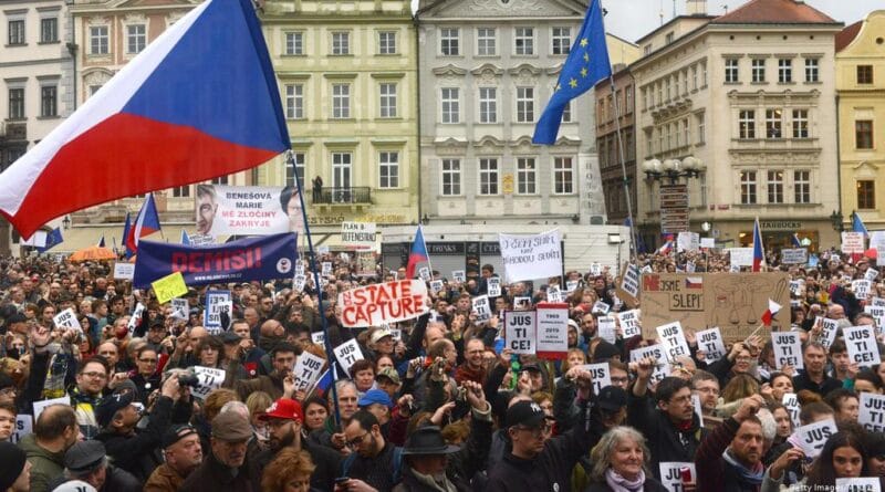 Păstrând distanţarea socială pentru a respecta reglementările impuse ca urmare a pandemiei de COVID-19, protestatarii s-au adunat în piaţa Wenceslas din Praga, susţinând că politica preşedintelui Zeman împinge Cehia în braţele Rusiei.
