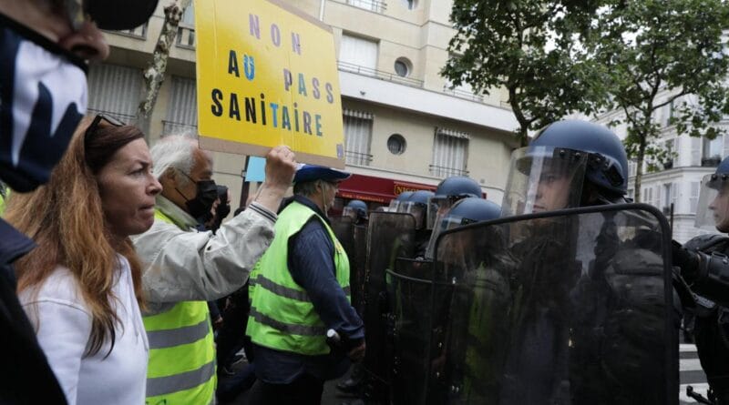 Opoziția față de imunizare și permisul sanitar rămâne ridicată în Franța și a provocat numeroase proteste, unele violente, de când administrația Macron a anunțat planul de a impune vaccinarea.