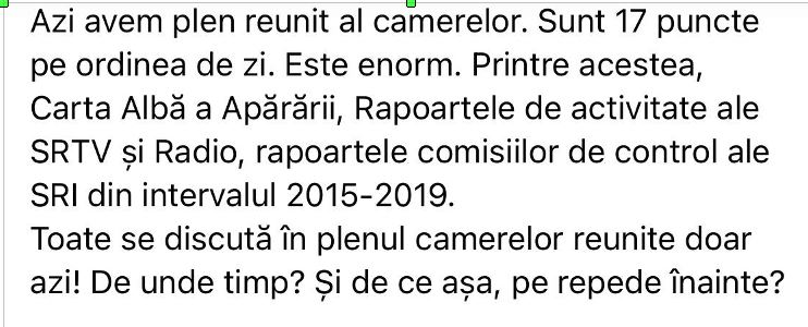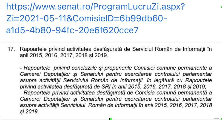 Un domn parlamentar invizibil (sau un consilier, poate chiar o secretară de prin parlament) mi-a trimis pe WhatsApp un mesaj însoțit de un link. Pentru a înțelege mai bine situația, vă invit să citiți reproducerea mesajului și să vedeți (eventual să deschideți și dumneavoastră linkul la adresa de mail la care se găsește programul invocat de cititorul nostru) cum au procedat. La ordinea de zi a Camerelor reunite, la punctul 17, au îngropat abordarea Rapoartelor de activitate ale SRI pe ultimii cinci ani. După desemnarea unui interimar la Radio România Actualități și la TVR. La coadă, unde nimeni nu mai are răbdare, unde se trece în fugă, unde totul a fost redus la o chinuită formalitate. Societății românești i-a fost oferit un simulacru de raport, o mimă de dezbatere, o fandoseală de analiză. Geaba le-au adus! Nici membrii Comisiei de control parlamentar asupra activității SRI nu vor fi apucat să le citească și să pună întrebări. Asta, în ciuda faptului că la respectiva comisie și secretarele și curierii și șoferii de serviciu erau atent selecționați iar stenogramele ședințelor erau transcrise unde altundeva decît la SRI.