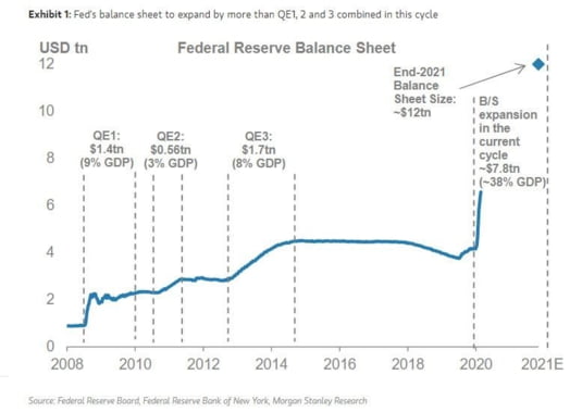 Au trecut anii si economia americana s-a imbolnavit de o noua boala, de data asta o pandemie. Nu-i nimic, doctorul FED ii aplica acelasi tratament: o noua cura de QE, adica noi sume de bani “noi” aruncati in piata. Si pentru ca pare o boala acuta, doctor FED ii da o doza mai mare: peste 7.000 de miliarde de dolari, nici mai mult nici mai putin decat aproape 38% din PIB. Activele FED vor ajunge, astfel, la anul, la astronomica valoare de 12.000 miliarde de dolari (cam cat PIB-ul nominal al Chinei!):