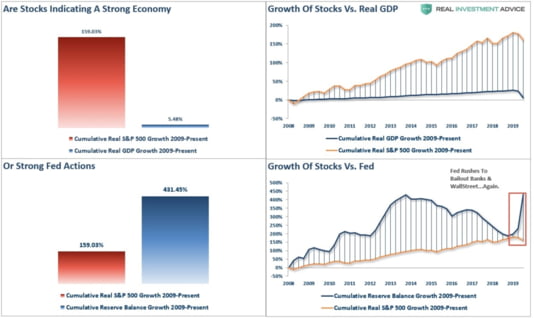 Las, deocamdata, la o parte ideea glumeata ca orice boala poate fi doftoricita cu acelasi leac si incerc sa va arat cam cum arata organismul “vindecat” al economiei americane. Iata o tomografie reusita: cresterea reala a PIB-ului, de atunci pana azi, este mai putin de 6%, valoarea indicelui S&P 500 (cele mai mari 500 de companii listate la bursa de la New York) a crescut cu 160%, iar activele FED au crescut cu peste 400%! Pare ca tinta doctoriei a fost sa creasca activul FED, nu economia reala.