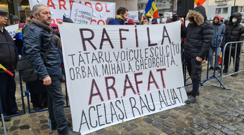 Doi protestatari au afișat un baner cu mesajul: „Rafila, Tătaru, Voiculescu, Cîțu, Orban, Mihăilă, Gheorghiță, Arafat – Același rău ALUAT”